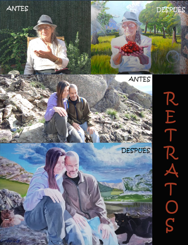 Los encargos pueden ser retratos de personas o animales, paisajes o bodegones ó lo que te guste. En el caso de retratos, se realizan aportando una foto digital, de calidad, que te guste y el fondo o paisaje a tu elección, que transmita algo de la persona retratada